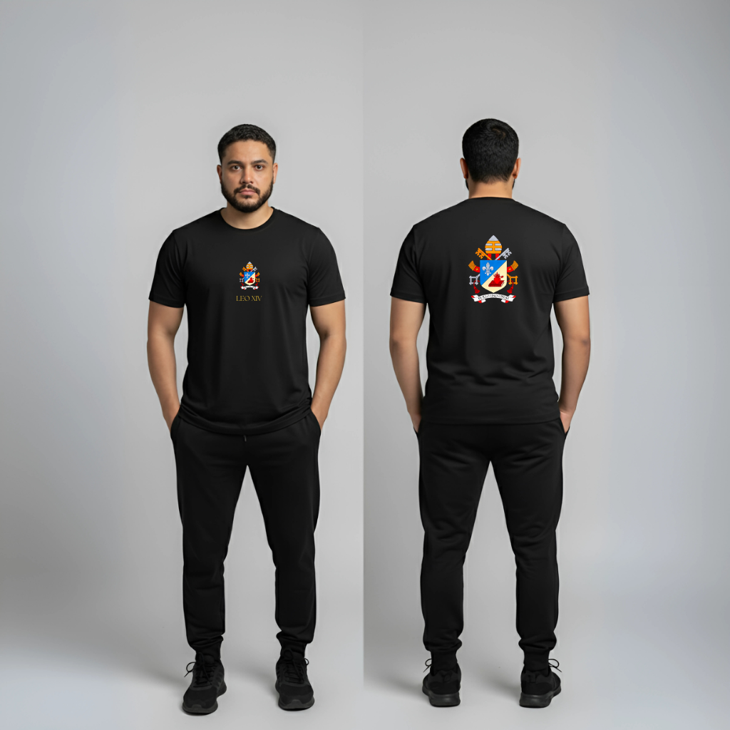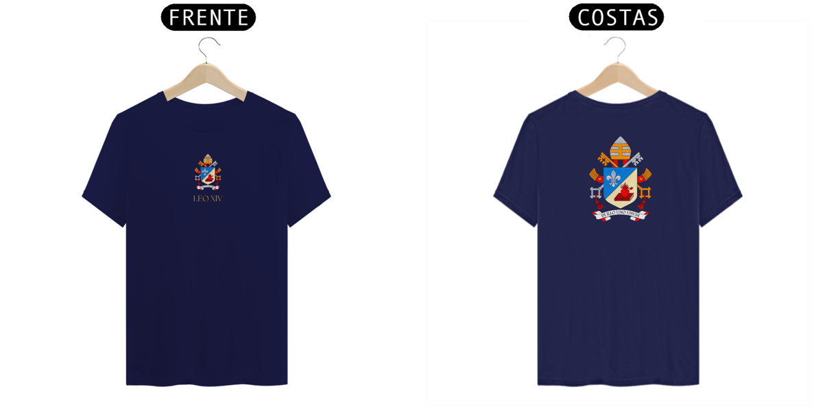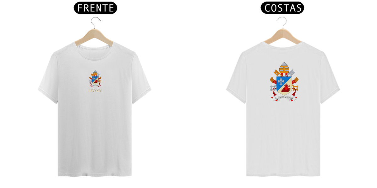 O brasão de Leão XIV é composto por um escudo partido em barra diagonal: na parte superior, fundo azul com uma flor-de-lis (símbolo mariano e de pureza); na inferior, fundo claro ostentando um livro fechado sobre o qual repousa um coração transpassado por uma flecha, aludindo à experiência de conversão de Santo Agostinho, expressa no seu próprio lema bíblico “Vulnerasti cor meum verbo tuo” (“Feriste meu coração com a tua Palavra”).